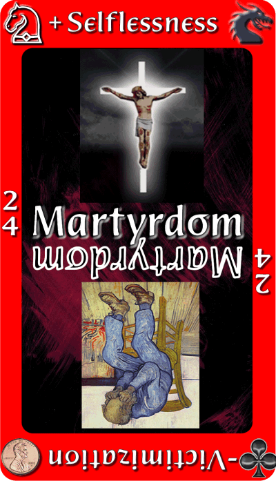 In the positive pole, the Martyr sees themselves as less relevant to life than to that of some cause of ideal. Like Jesus, Kennedy or ML King, this belief in some higher aspiration can actually make them feel superior for their efforts. Thus contradicting the notion that the martyr, even in this pole is actually sacrificing themselves. Instead, they are attempting to buy a status of one most loyal.